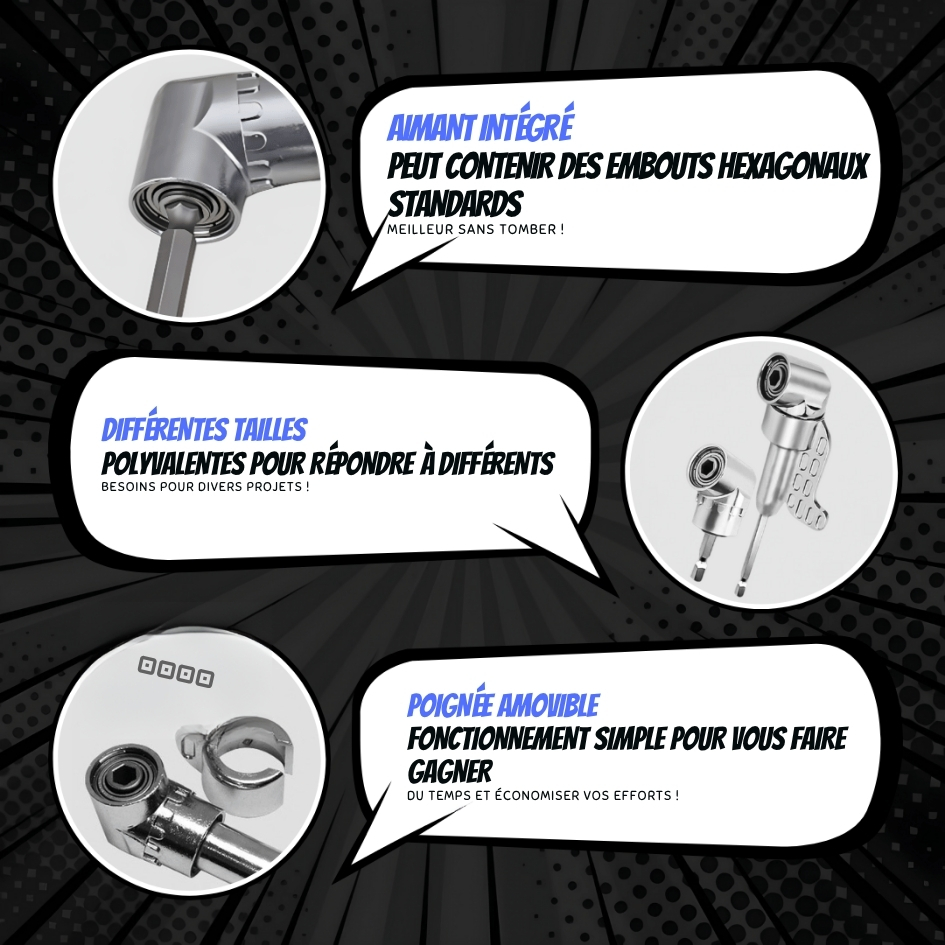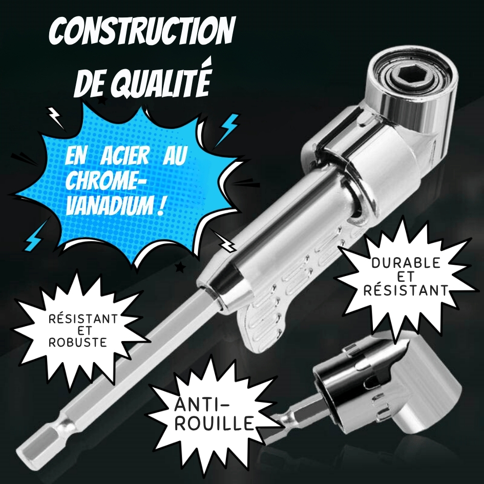 AngleFlex Pro™ a été pensé pour les bricoleurs exigeants, qu’ils soient amateurs éclairés ou pros. Chaque détail compte : la rotation fluide, le maintien magnétique de l’embout, la résistance à la torsion et la compatibilité avec les outils les plus courants. Nous avons mis l’accent sur la durabilité, la facilité d’usage et la sécurité, pour que cet embout devienne un réflexe dans votre caisse à outils.
