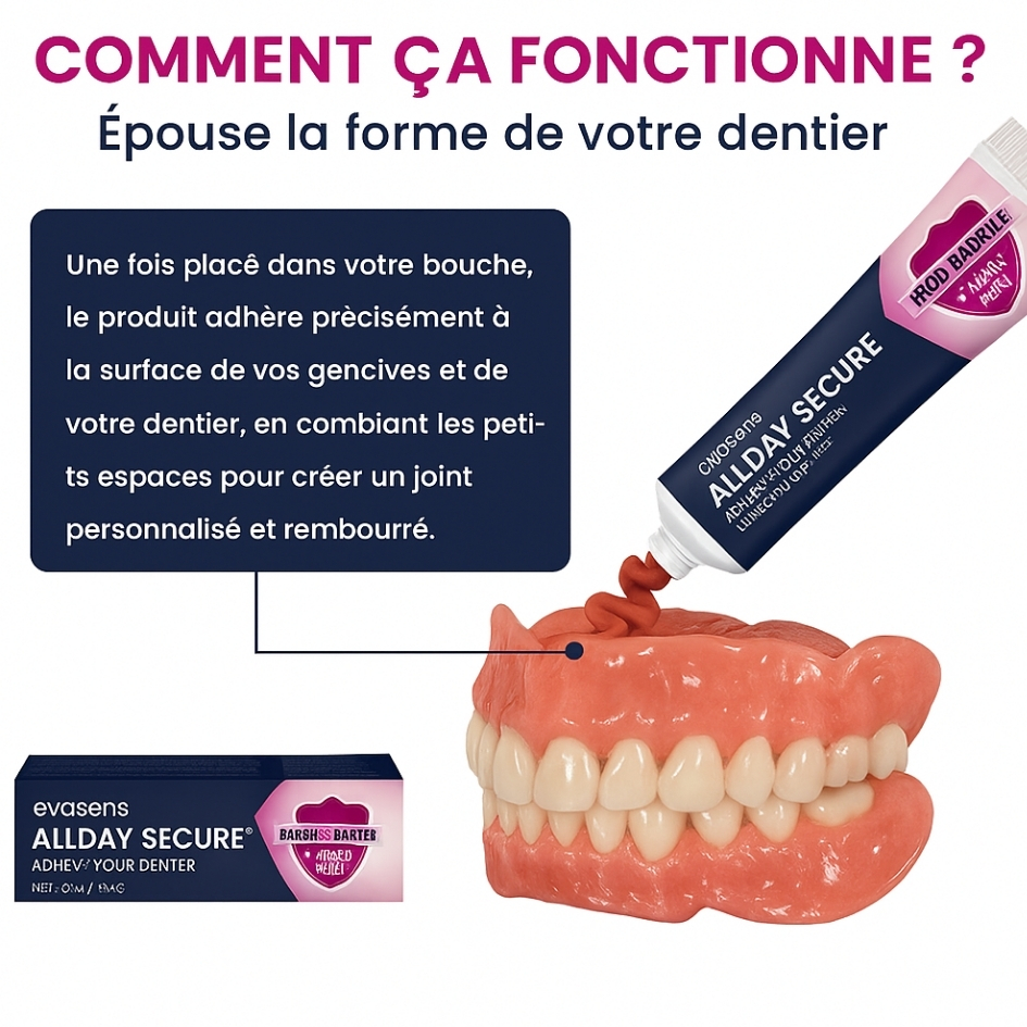 Développé avec des professionnels dentaires, AllDay Secure™ répond à un cahier des charges strict : zéro zinc, compatibilité matériaux (acrylique, métal, porcelaine), confort sur gencives sensibles et tenue multi-jours testée en conditions de vie réelle. Chaque composant a une fonction claire, utile et mesurable.