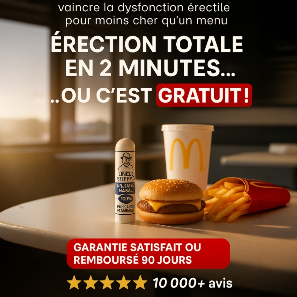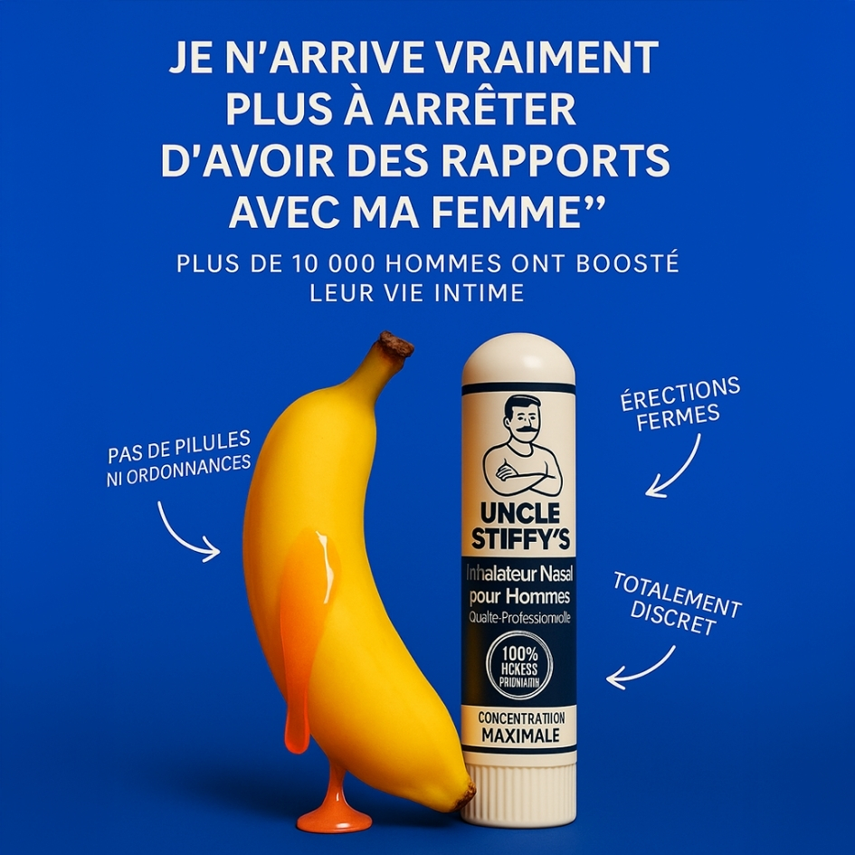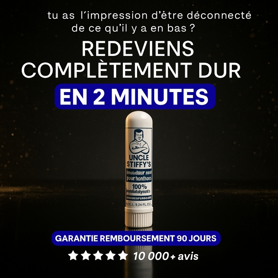 Je suis en couple depuis plus de 20 ans et, ces dernières années, je voyais bien que quelque chose n’allait plus. J’avais envie, mais l’érection ne suivait pas ou retombait trop vite. J’ai testé plusieurs pilules, certaines fonctionnaient mais avec des maux de tête et un cœur qui s’emballe. Uncle Stiffy™ m’a surpris : une inhalation avant de passer à l’action, quelques minutes d’attente pendant les préliminaires… et le reste se passe tout seul. Ma femme m’a dit qu’elle me retrouvait « comme avant », mais surtout, moi je me sens à nouveau à ma place.