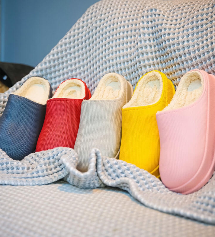Le revêtement peluche garde une chaleur douce et absorbe légèrement l’humidité. Pour les personnes très sensibles à la chaleur, portez-les pieds nus à la maison et aérez régulièrement la semelle.
