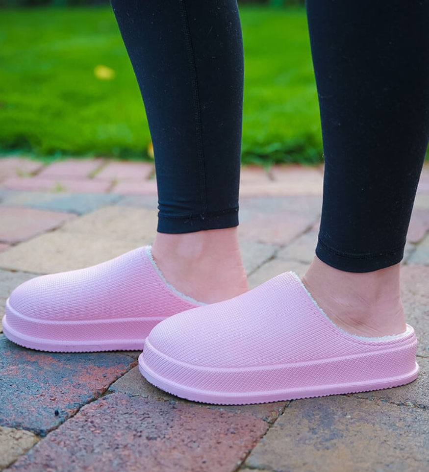 Oui, la semelle EVA est résistante et antidérapante, idéale pour la terrasse, le jardin ou des sorties rapides. Évitez toutefois les terrains abrasifs prolongés pour préserver la peluche et l’amorti sur la durée.